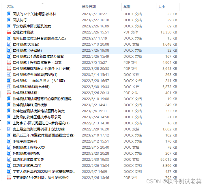 我个人整理了我这几年软件测试生涯整理的一些技术资料,包含:电子书,简历模块,各种工作模板,面试宝典,自学项目等。欢迎大家点击下方名片免费领取,千万不要错过哦。