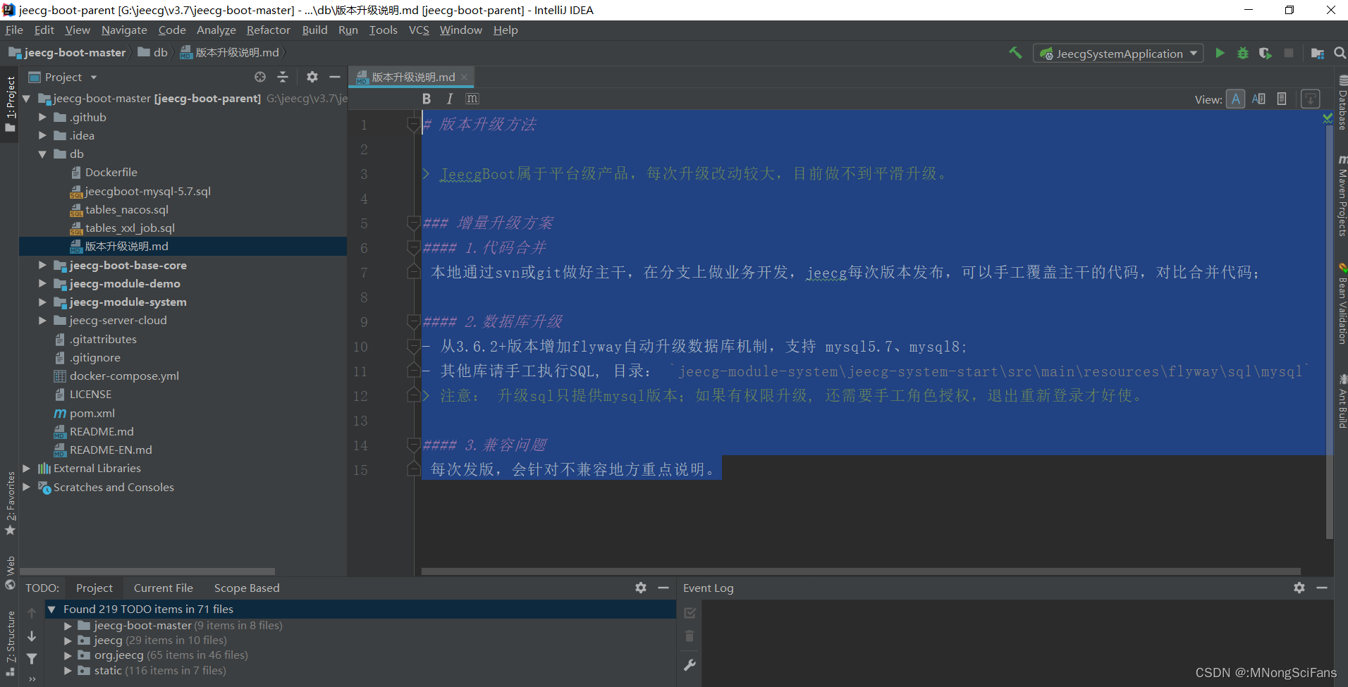 # 版本升级方法 > JeecgBoot属于平台级产品,每次升级改动较大,目前做不到平滑升级。 ### 增量升级方案 #### 1.代码合并 本地通过svn或git做好主干,在分支上做业务开发,jeecg每次版本发布,可以手工覆盖主干的代码,对比合并代码; #### 2.数据库升级 - 从3.6.2+版本增加flyway自动升级数据库机制,支持 mysql5.7、mysql8; - 其他库请手工执行SQL, 目录: `jeecg-module-system\jeecg-system-start\src\main\resources\flyway\sql\mysql` > 注意: 升级sql只提供mysql版本;如果有权限升级, 还需要手工角色授权,退出重新登录才好使。 #### 3.兼容问题 每次发版,会针对不兼容地方重点说明。