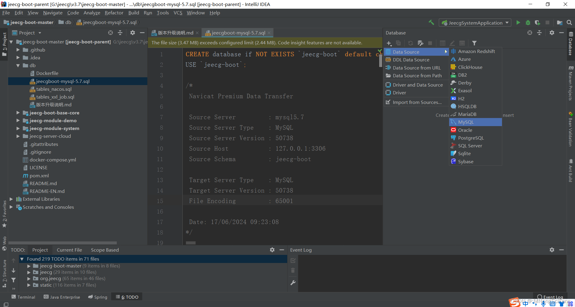 - 数据库脚本:MySQL5.7+ & Oracle 11g & Sqlserver2017(其他数据库,[需要自己转](https://my.oschina.net/jeecg/blog/4905722))