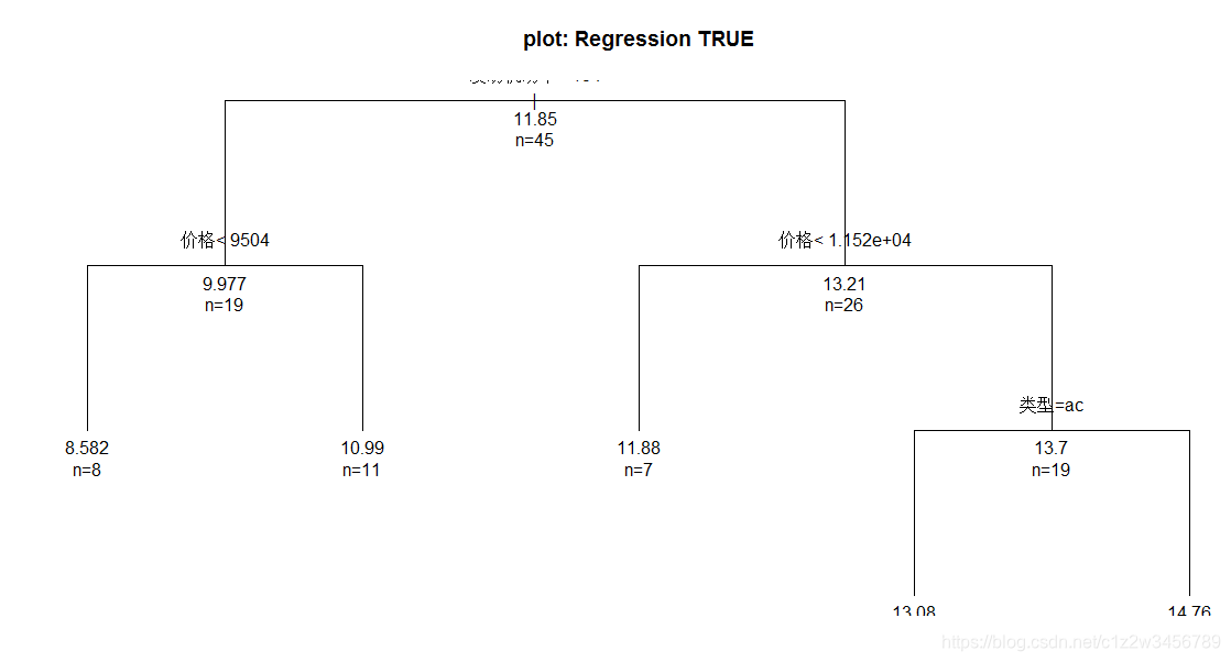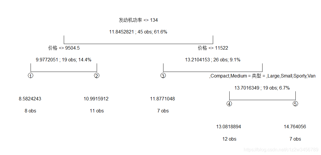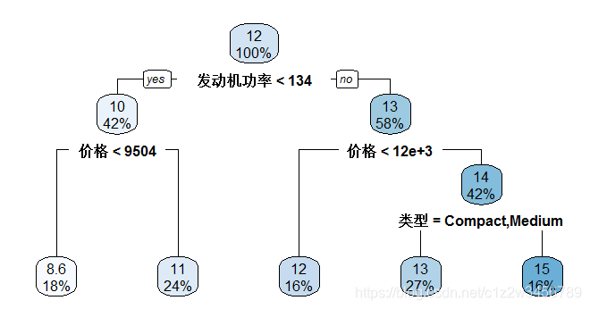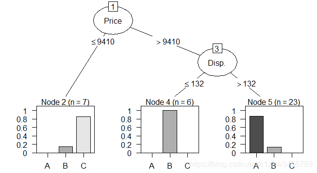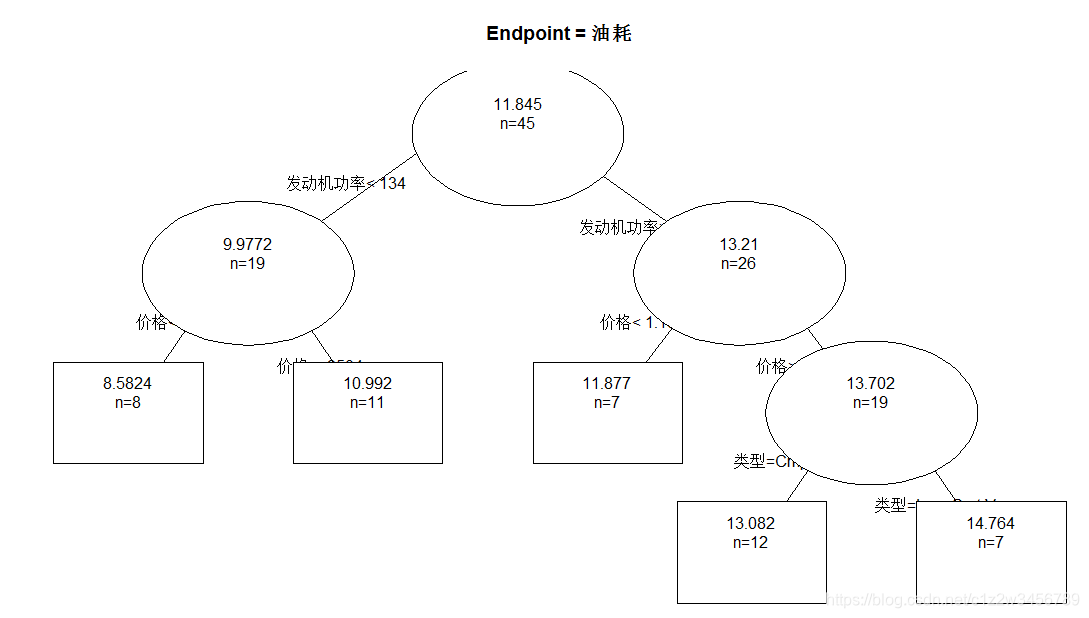 > #以上输出结果与回归树类似,不同之处仅在于每个节点的预测值不再是具体数值,而是A、B、C,即分组油耗的三个取值水平。
