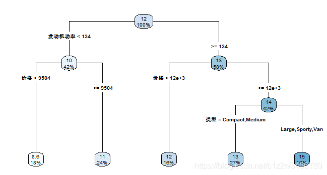 #发动机高于134的且价格高于1万美元的车,属于A类,高油耗;最左边的分支,反之属于C类,最右侧分支。