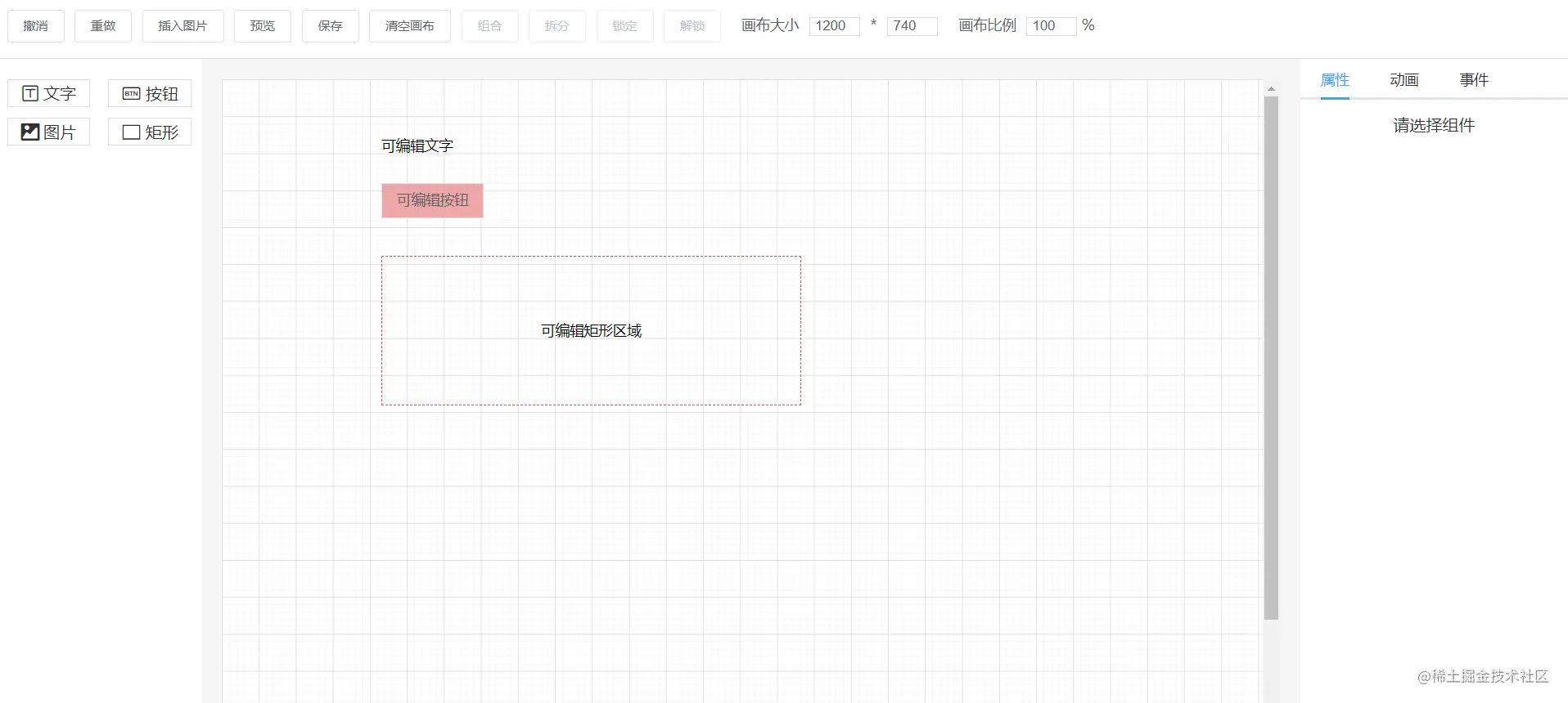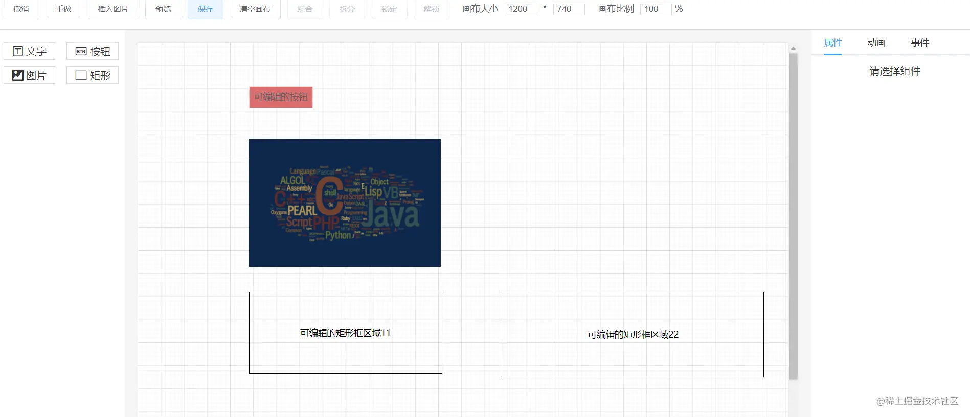 我们在前端开发脚手架中,通常会创建一些通用的组件,然后在各个需要这个组件的地方进行引用,来提升开发效率。在脚手架中引用一些ui组件库也是出于这样的目的。为了防止重复的造轮子,我们通常会对一些成熟的ui组件库中组件根据我们的业务需要进行二次封装,形成一个具有更多功能的区块,如下图式演示demo 的区域展示部分:我们可以看见按钮、矩形区域、图片区域等都可以风转成固定组件,通过拖拽到指定大区域中形成我们需要的页面元素展示样式。