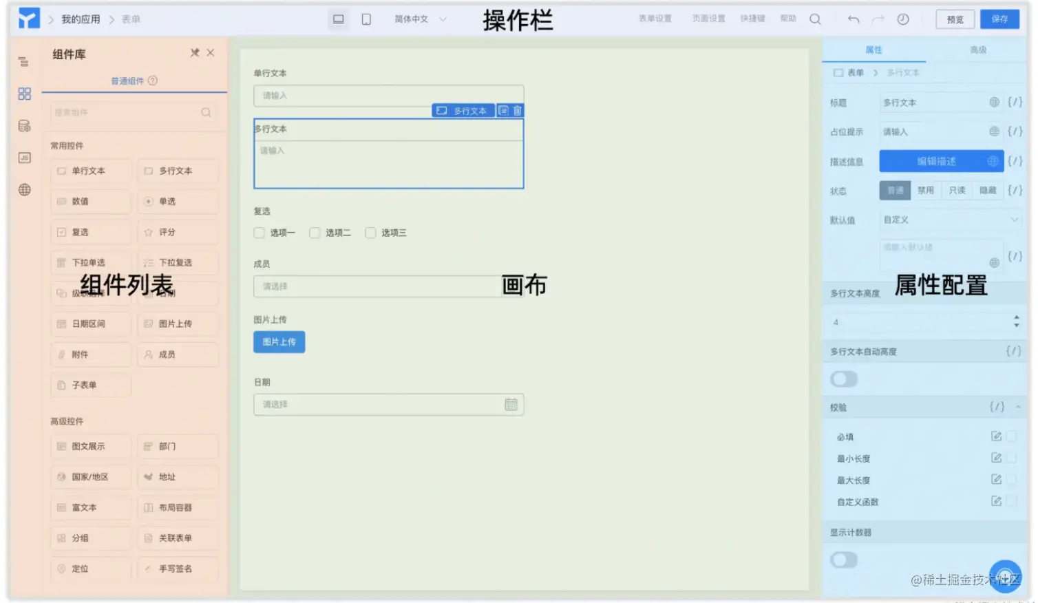画布区域,我们可以将左侧的组件拖动到画布中,当然也支持画布中组件的赋值、删除等操作; - 右侧是