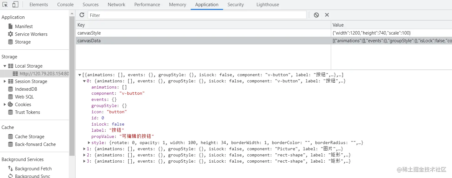 我们可以通过一个json数据来描述这个区块,数据大概是下图所示的样子,包含了这个区块的编码,中文名称,以及可传入到这个区块中的属性及初始属性值,例如这个表格包含的列信息、按钮信息等等。而这个json也是低代码平台搭建中最为核心的部分,它在后续介绍的可视化拖拉拽页面设计中扮演极其重要的角色,它是页面设计和页面渲染间串联的纽带。如下图所示,是我们当前demo 操作在localstorage 中存储的json 数据,其中包含上图中展示的4个组件的所有组件信息(icon、 label、 name、 events、 component等)。