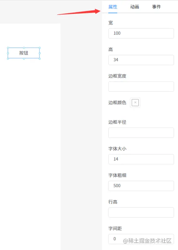 属性配置区域,当我们在画布中选中某个组件时,可以在右侧的属性配置区域罗列出当前组件可支持动态配置的属性,修改了属性后可以在画布中看到对应组件的样式变化。