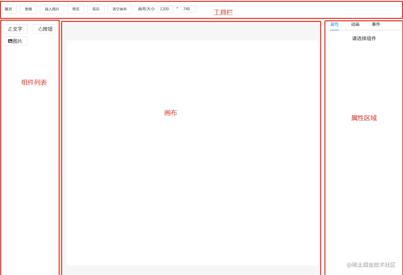 低代码开发平台都是通过拖拉拽可视化的页面设计器进行页面开发的。我们来探索一下页面设计器的实现方式大多数的页面设计器都包含了如下所示的几个区域: