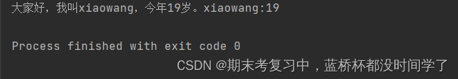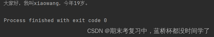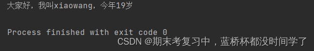 print('大家好,我叫{name},今年{age}岁。'.format(name = "xiaowang",age = 19))