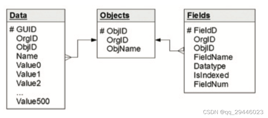Salesforce在早期使用的是Oracle数据库,Data表上有500个字段,依次为Value0,Value1...Value500。每个Object上的Field都有个唯一编号:0,1,2...500。每条Data记录只能属于一个Object(见图中的ObjID),然后Value0就是第一个字段的值,Value1就是第二个字段的值,以此类推。