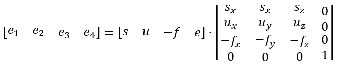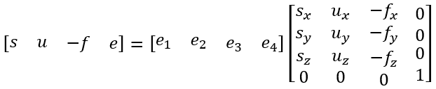 对于任意向量 v = [a, b, c, 1] 在向量 s、u、-f、e 下的矩阵表示如下: