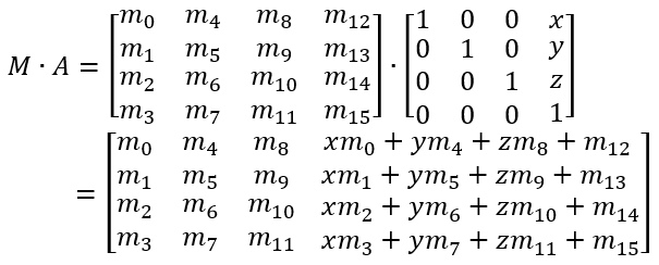 m[12 + mi] += m[mi] * x + m[4 + mi] * y + m[8 + mi] * z;