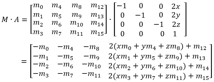 代码如下(Matrix 类中没有对称变换,此方法是笔者写的),m 为初始矩阵,通常取单位矩阵;moffset 为索引偏移,表示 m 中 moffset 之前的数不参与变换,通常取 0; [x, y, z, 1]' 为对称轴。