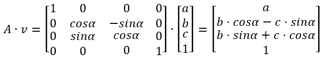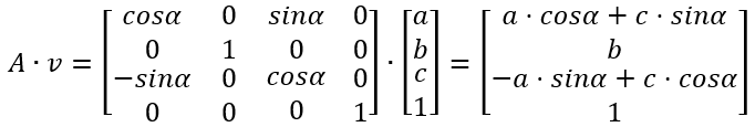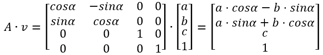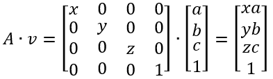 空间坐标系建立后,空间中任何一个点都对应一个向量,设空间中一向量为 [a, b, c]',为方便采用统一的格式描述线性变换,将三维空间中的向量 [a, b, c]' 映射到四维空间中的向量 [a, b, c, 1]',同时,线性变换采用 4x4 的矩阵描述。所有向量 [a, b, c, 1]' 生成的空间仍然是一个三维空间,它是四维空间中的一个三维子空间。对与某些线性变换(如平移变换),若使用 4