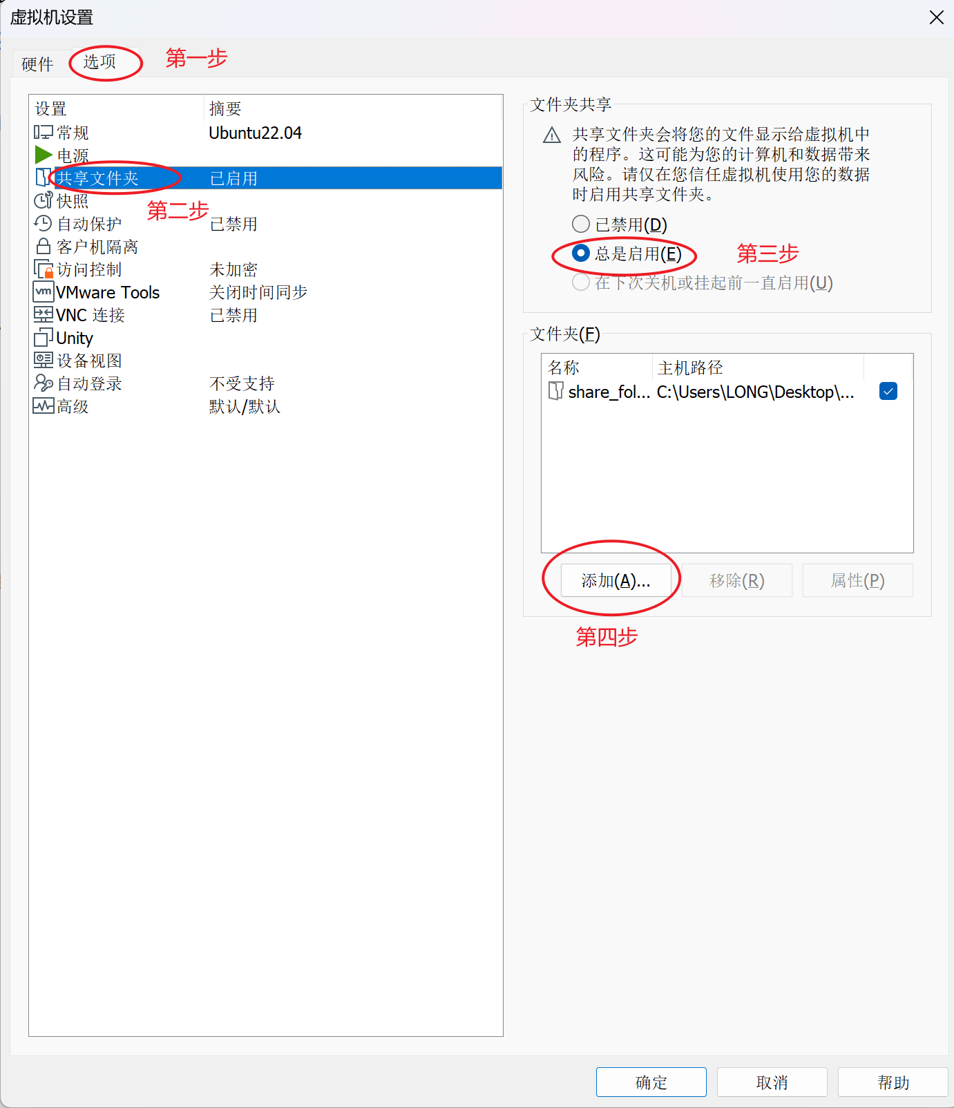 点击选项,双击共享文件夹,打开总是启用,然后点击添加。
