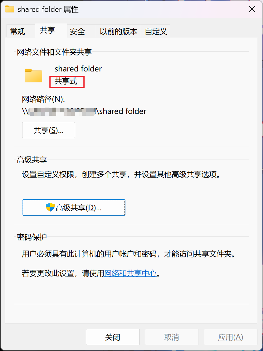 直接选择共享此文件夹,点击确定,会显示共享式: