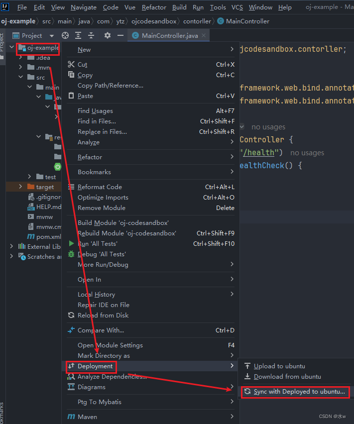 (3)在项目的根目录处点击右键,依次按照下图中的流程,选择“sync with Deployed.......”同步部署,
