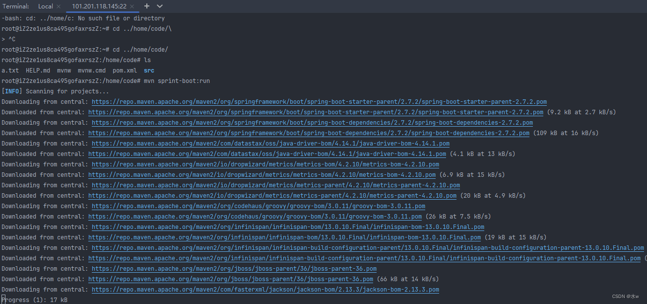 在本地的idea终端的远程连接服务器的终端里,输入下列命令,