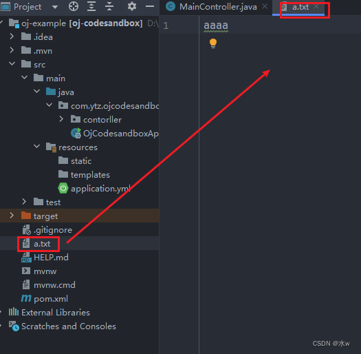 现在我们测试一下,在项目下新建一个“a.txt”文件,输入一个字符串,