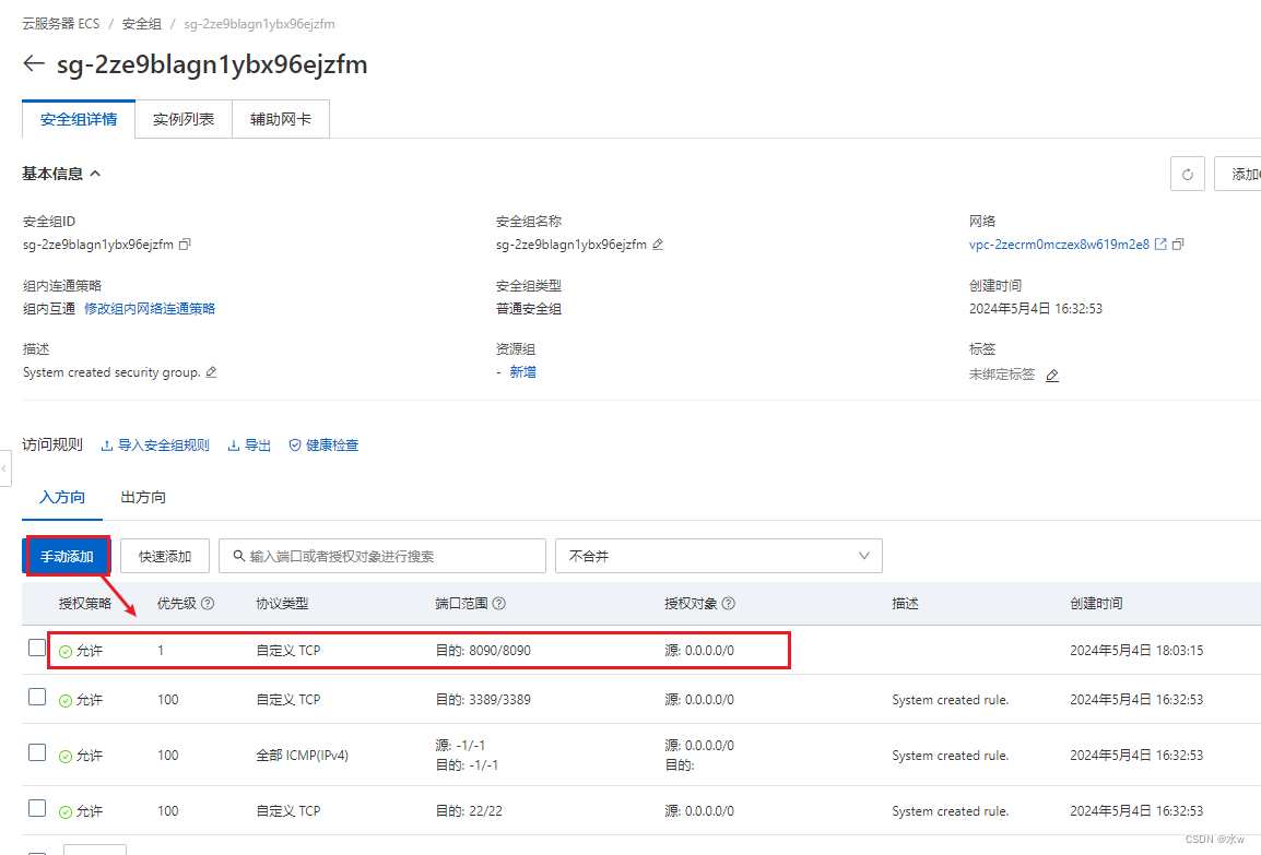 (2)需要在阿里云服务器的官网登录自己的账号,打开服务器端的安全组,