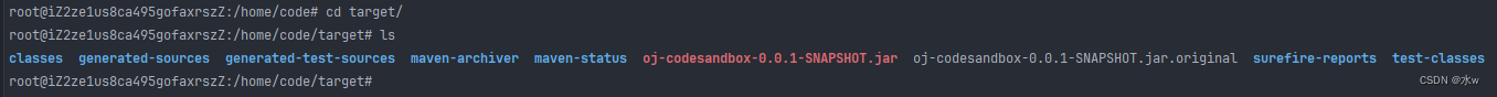然后,我们现在可以看到inux服务器上的home/code/target下已经有jar包了,