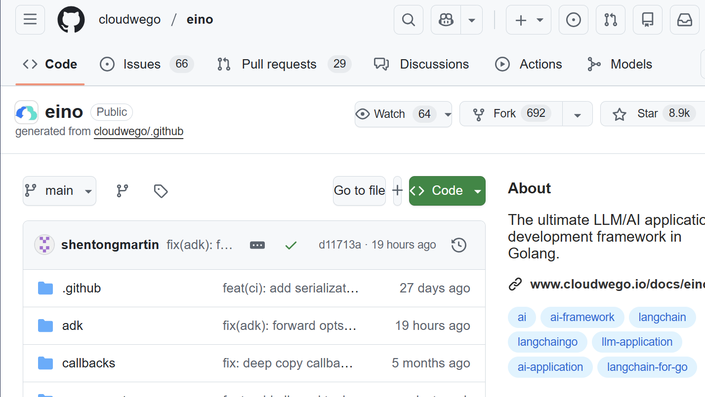 Eino 框架的开源地址是:https://github.com/cloudwego/eino,主要面向有一定编程基础的开发者,适合用于构建复杂的、定制化程度高的 AI 应用。