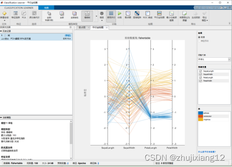 在分类学习器中也可以利用平行坐标图(Parallel Coordinates Plot)来选择特征,具体操作为单击分类学习器窗口的绘图中的平行坐标图按钮,生成平行坐标图。