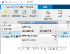 利用主成分分析来降低特征空间的维度,有助于防止过拟合。PCA能够消除数据中的冗余信息,产生一个新的变量集,该变量集称为主成分。在工具箱中使用PCA包括以下步骤:(1)在分类器的特征中单击PCA按钮;(2)在高级PCA选项中选中启用PCA,并设置响应参数(一般采用默认)。至此,用户已完成了对PCA的设置,之后,当用户点击Train的时候,PCA会首先对数据做变换和处理,然后进行模型训练。