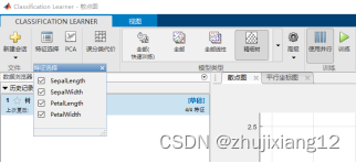 在分类学习器窗口,也可以通过勾选耨个特征,观察分类器的表现。如果删除某个特征后可以提高模型的性能,那么应该排除这个特征,尤其是当收集该数据比较昂贵和困难的时候。具体操作为单击特征组中的特征选择按钮,可以取消勾选特征中特征名称后的复选框。