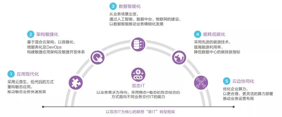 正如童夫尧所言,现实场景呈现客户需求复杂化、功能结构化、角色多元化等难点。对解决方案商而言,再没有所谓“一招鲜、吃遍天”的侥幸,而是要全面融会各种能力,这些能力体现在联想以“双态”(稳态&敏态)为核心的“新IT”转型框架,以及围绕应用现代化、架构敏捷化、数据智能化、能耗低碳化、云边协同化的“五化”框架打造的“新IT”智能基础架构。