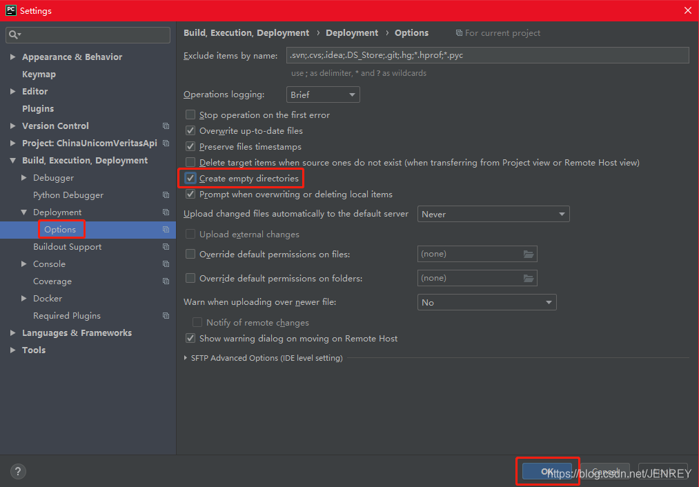 注意下图并不会把本地的ChinaUnicomVeritasApi文件夹上传过去,只会把ChinaUnicomVeritasApi下的文件上传到linux上面,所以要在下面两个红框的路径下写上文件夹的名字即ChinaUnicomVeritasApi,而且在下下图中要勾选create empty directories选项。