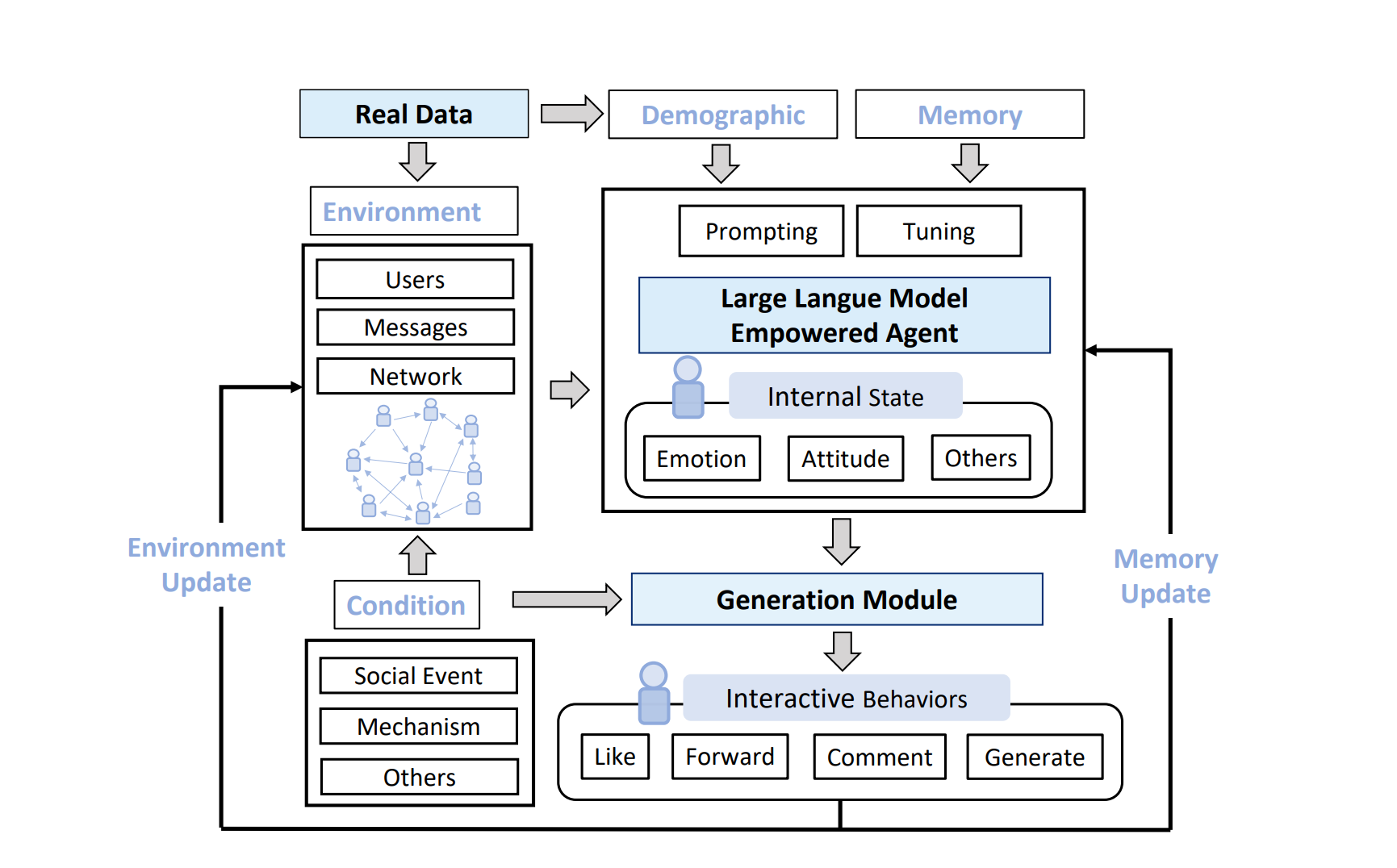 使用大型语言模型来复制单个用户,利用他们的配置文件和内存池作为提示来生成认知反应和行为响应。它们的抽象属性和内存池经历更新。当用户的内存池被修改后,这些消息就会传播,并在关注者阅读内容时对他们产生影响。