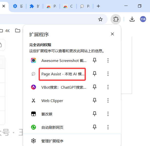 - 点击浏览器右上角的扩展程序图标,找到 Page Assist。