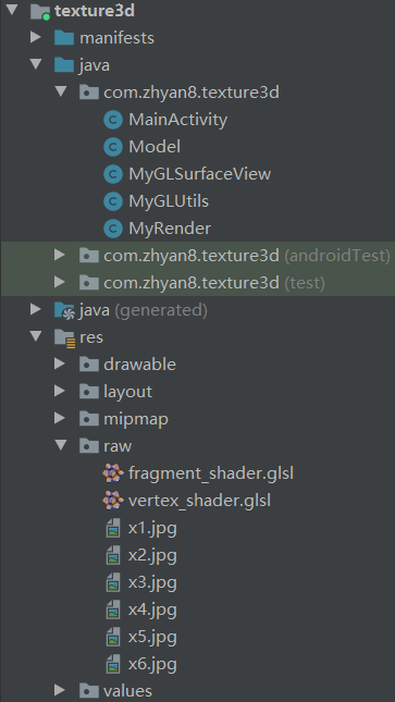 1 前言本文通过一个立方体贴图的例子,讲解三维纹理贴图的应用,案例中使用 6 张不同的图片给立方体贴图。本文涉及到的知识点主要包含:三维绘图、MVP 矩阵变换、纹理贴图,读者如果对 OpenGL ES 不太熟悉,请回顾以下内容:绘制立方体MVP矩阵变换纹理贴图项目目录如下:2 案例MainActivity.javapackage com.zhyan8.texture3d;import androi