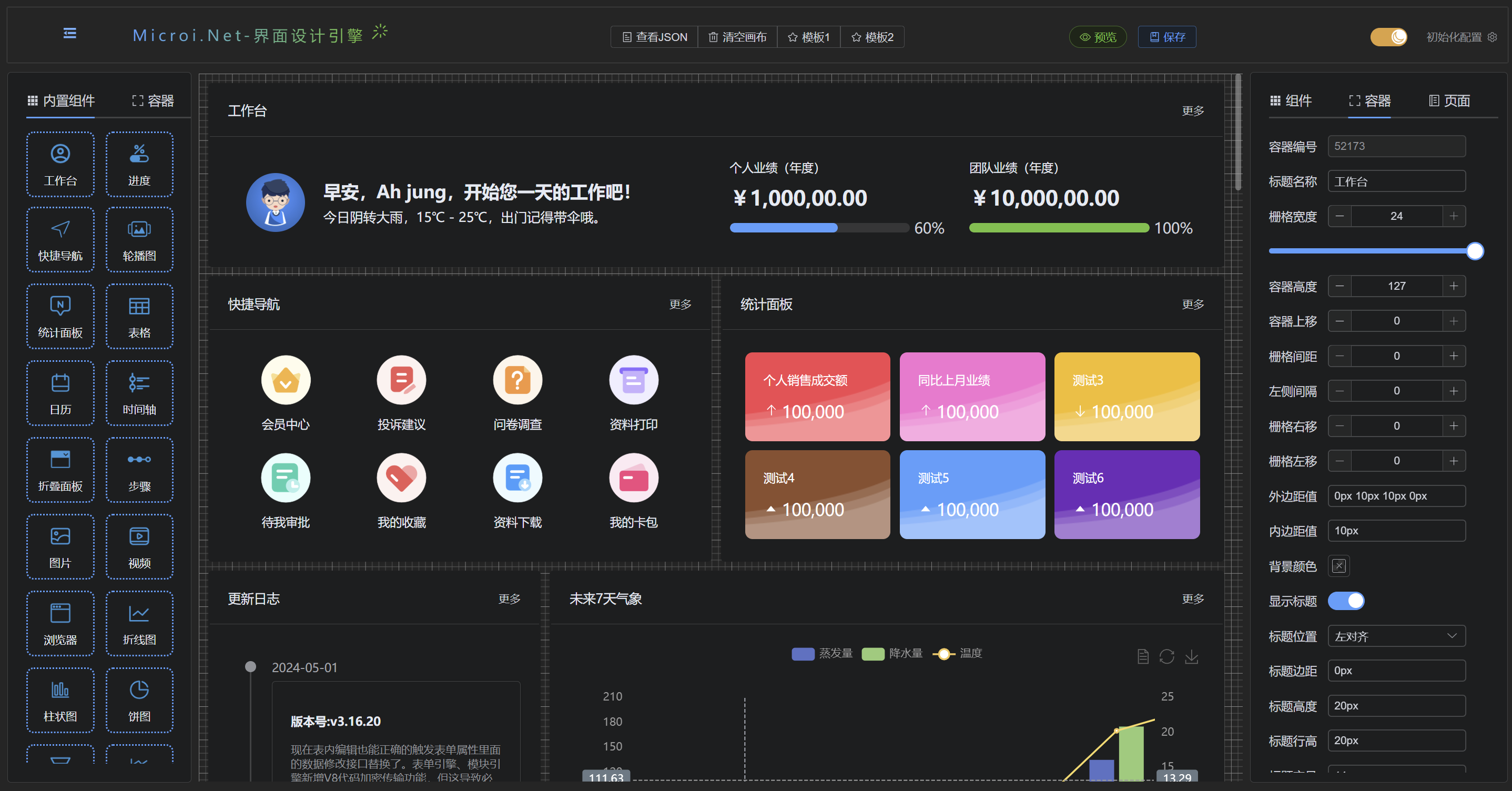 🔥Microi.Net-界面设计引擎主要解决了低代码平台页面如何快速设计的痛点.设计引擎分为设计器和渲染器两个核心组件,一个负责快速构建精美的页面,比如首页,动态看板,大屏等,另一个主要负责渲染,以数据驱动页面展示。🔥