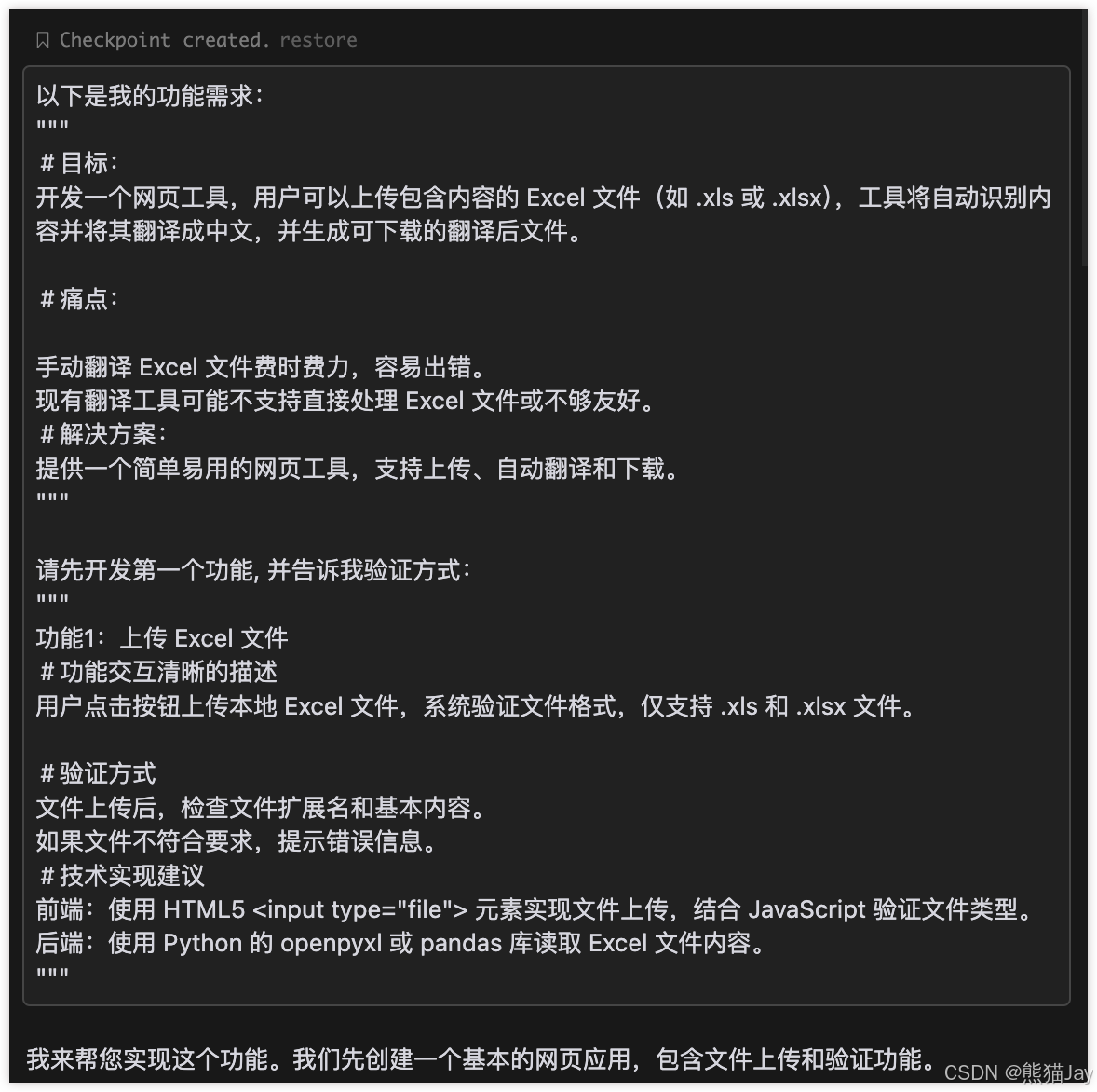 接下来,我们把需求分析和第一个功能整理成提示词发给 Cursor。