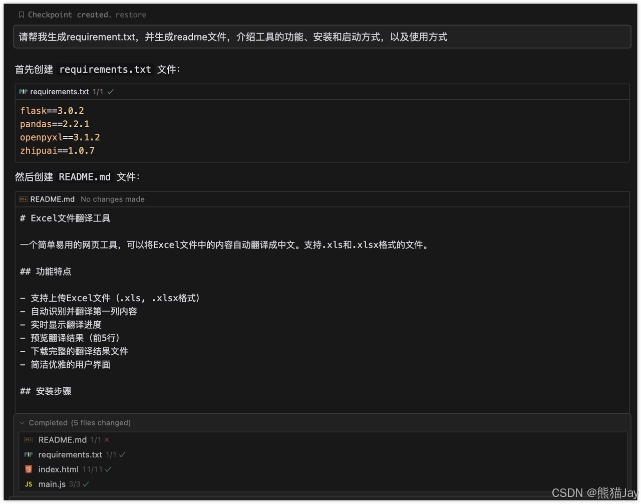 接下来,生成代码之后,我们要依据 Cursor 的提示词安装新的依赖,然后重新启动代码。