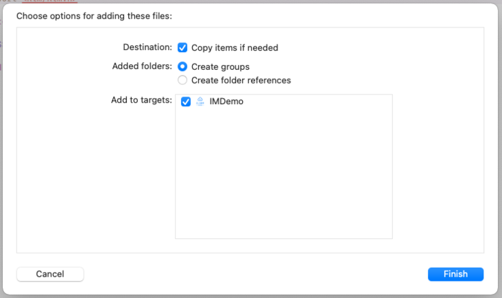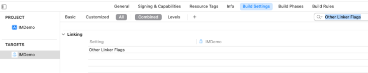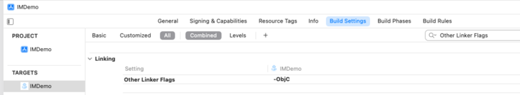 打开项目属性页面,选择“TARGETS” -> “IMDemo” -> “General”: