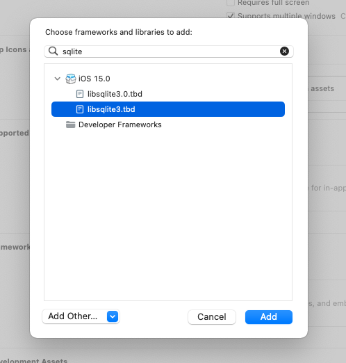在搜索框内输入“SQLite”,选择“libsqlite3.tbd”,点击“Add”按钮进行添加。
