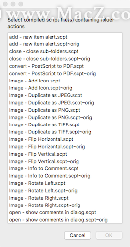 如果转到“ 文件夹操作”>“将脚本附加到文件夹”,则会弹出一个窗口,询问您要添加到文件夹的脚本类型。您可以水平或垂直翻转照片,将它们复制为JPEG或PNG,旋转它们,或在添加新项目时提示提醒。