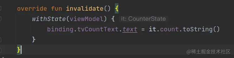 而在mavericks中,withState就可以搞定数据获取问题。所以在invalidate()被回调后,我们主动获取到最新的State。就像下面这样it:CounterState。