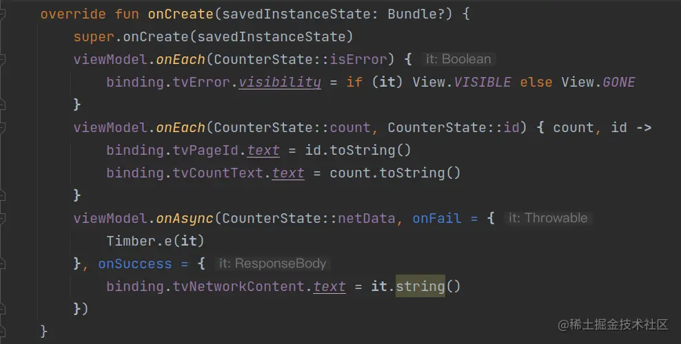 从上面我们不难看出State其实描述的就是UI的状态。那么越是复杂的UI或者越是复杂的业务,这个State中的字段肯定就越多。而这其中的任何一个字段值的变更都会触发invalidate()的回调。如果我们把所有数据绑定,控件更新的代码都写在invalidate()中,其中任何一个字段发生改变,都会触发和本字段无关的控件刷新,这肯定不是我们想要的结果。所以onEach()和onAsync()就有用武之地了。