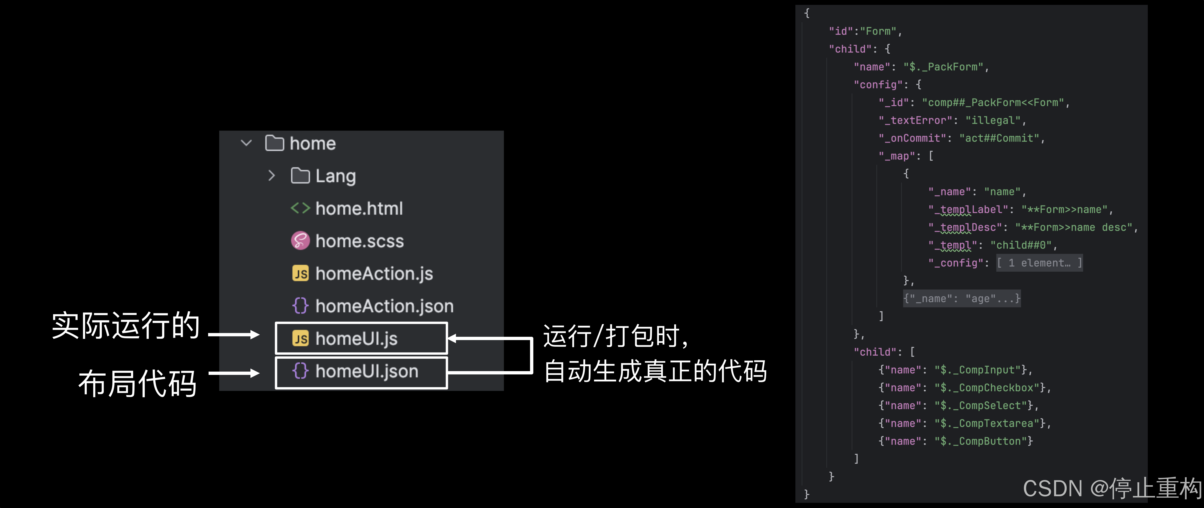 布局代码,只需要标记组件摆放位置和嵌套关系,所以布局代码实际上是一个JSON配置,无需编写真正意义的代码。