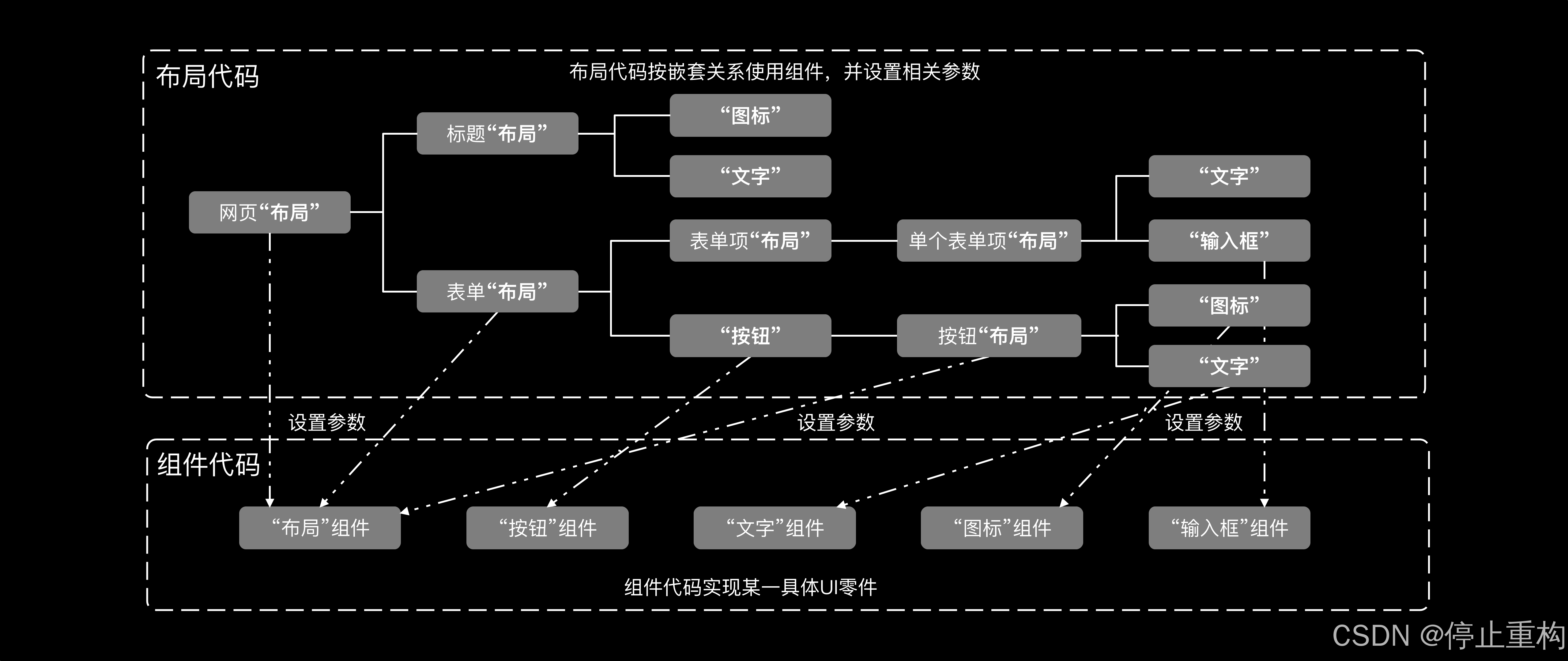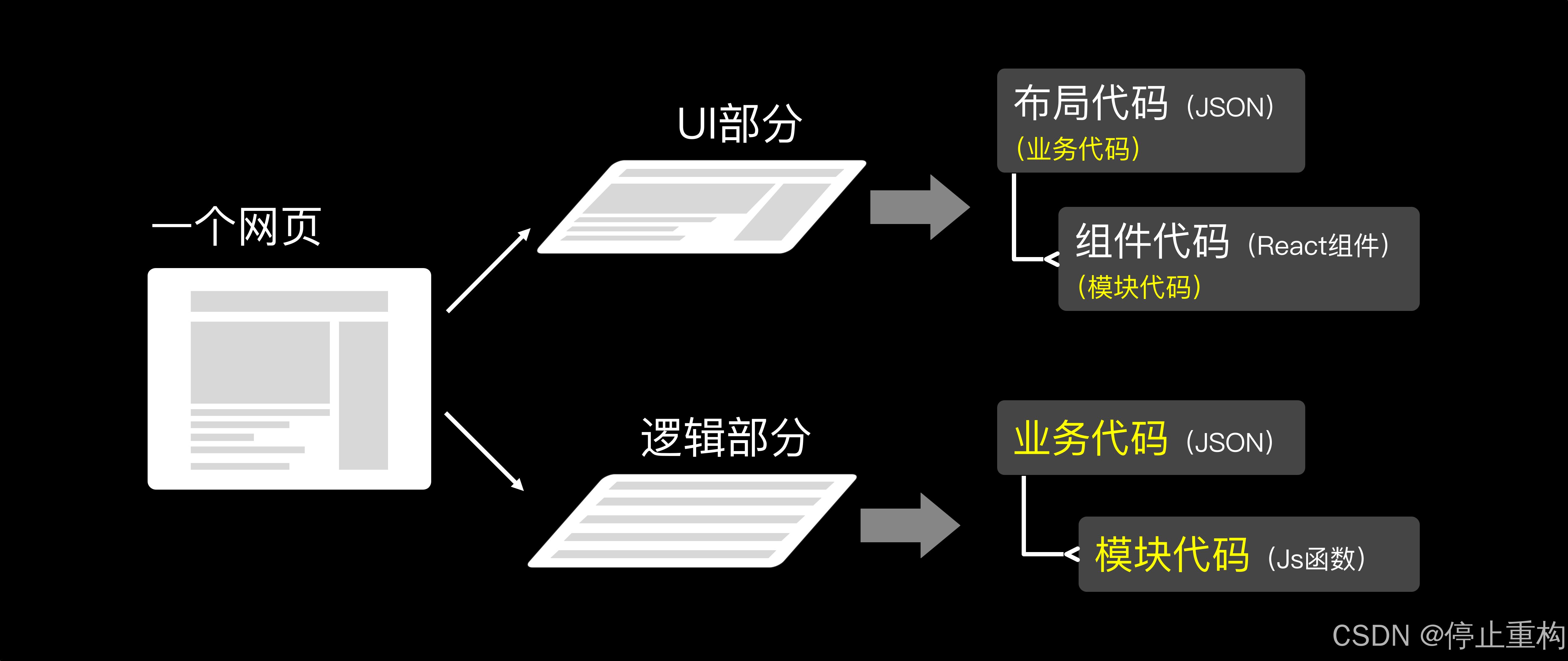 针对UI部分,Trick2将代码分离成了:模块代码、业务代码。为了防止与逻辑部分混淆,这里我们取一个别名:组件代码、布局代码。