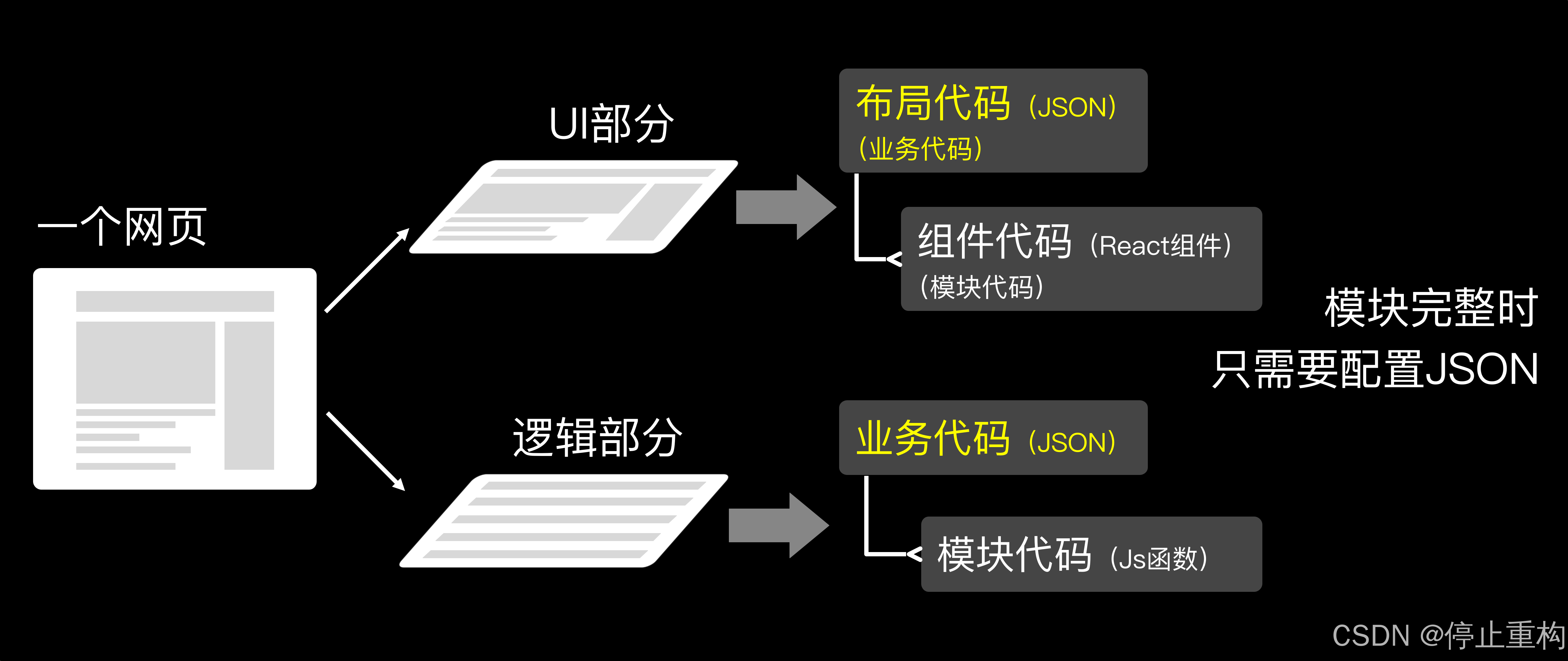 忠于原生网页开发的Trick1,仍然需要花大量的时间编写UI模块,UI模块的复用度也很低。且无法以配置Json的方式代替业务代码编写,也就无法成为真正的低代码内核。