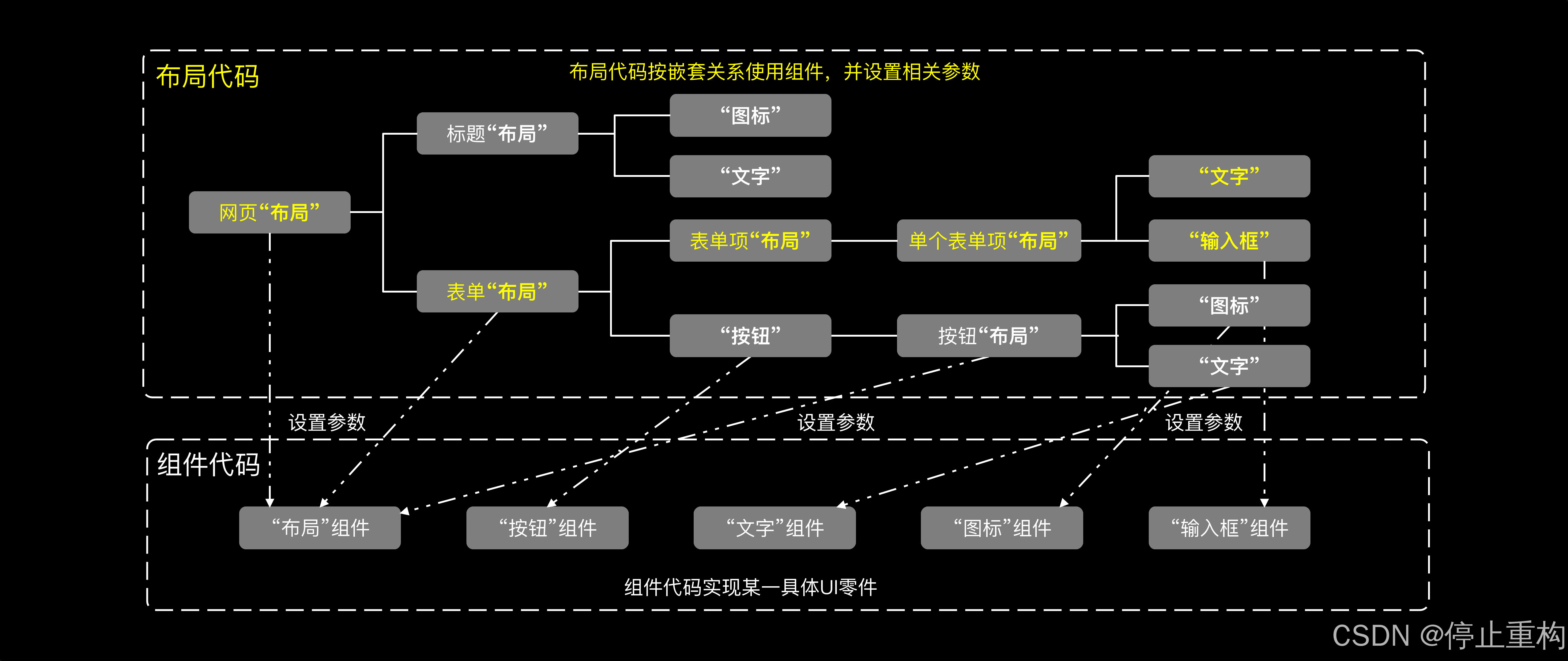 布局代码是具体页面的布局,只关心如何组织UI组件,也就是对组件摆放位置进行编排。
