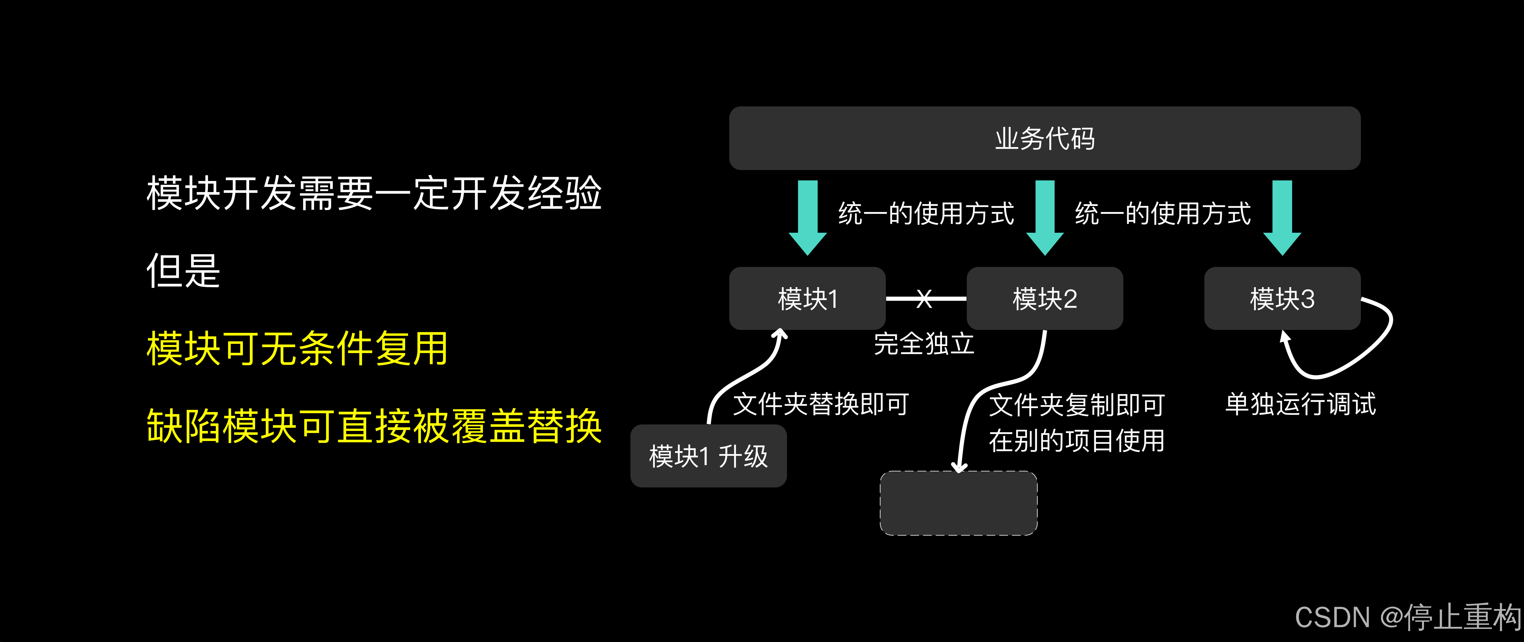但由于可以脱离业务,且模块是完全独立不允许相互关联的,所以这部分代码可以无条件复用在多个项目。