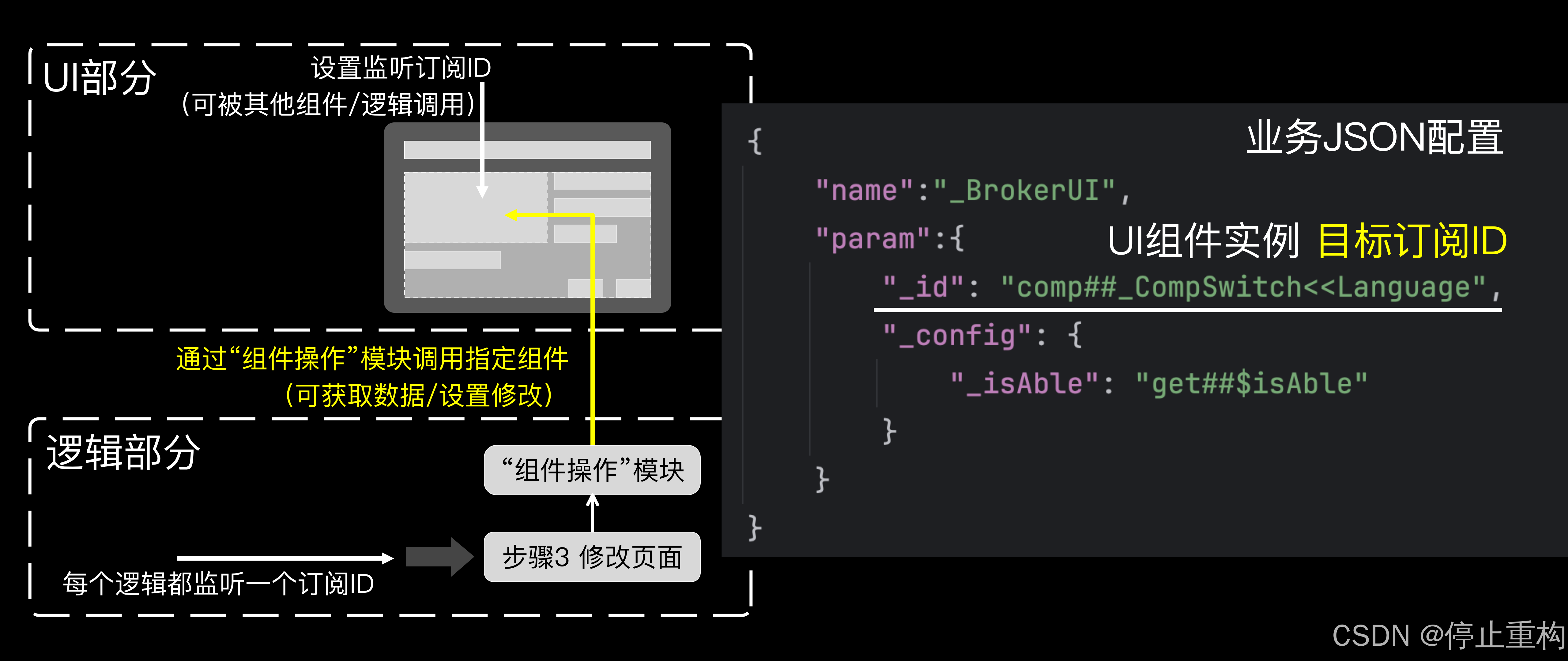 每个UI组件实例都可以设置订阅ID进行监听,每个逻辑功能都自动生成了订阅ID进行监听。
