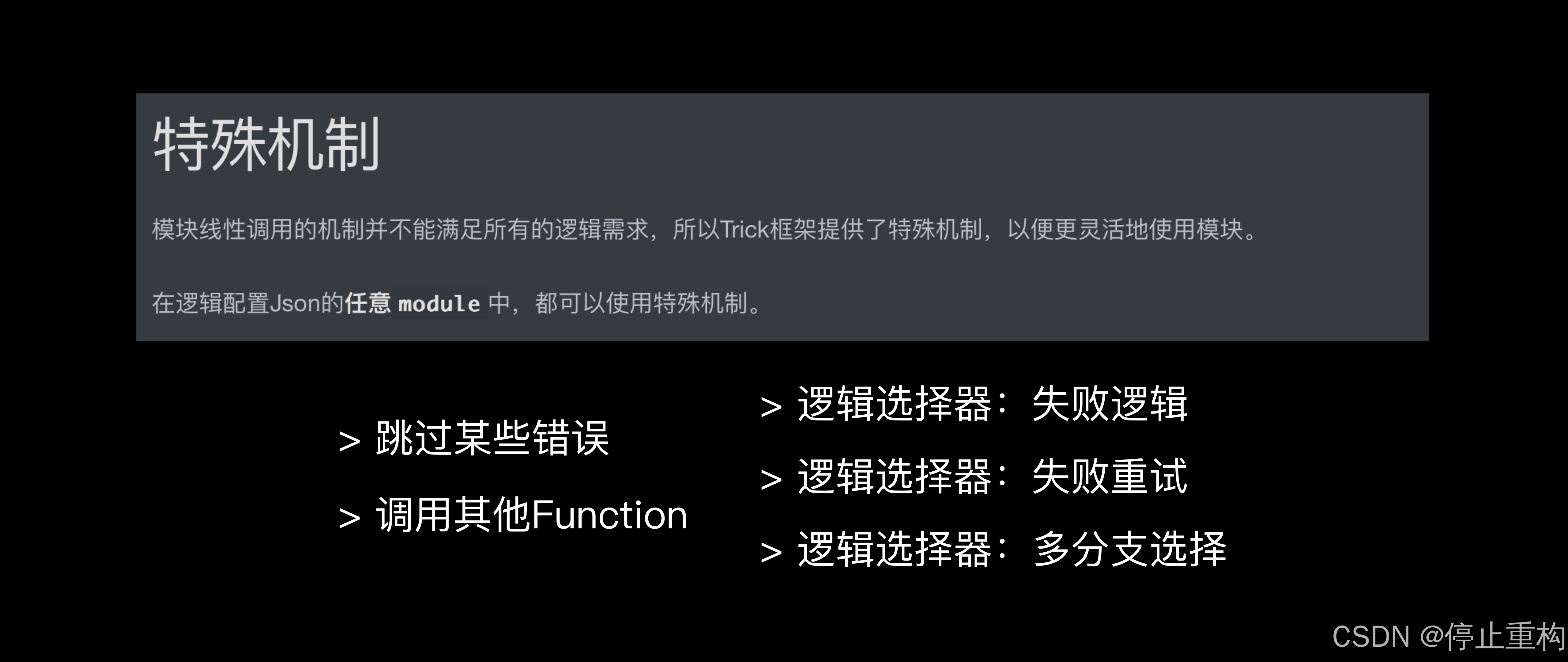 当然报错中断只是默认行为,可以添加逻辑选择器以实现更加复杂的逻辑,如发生错误重试、发生错误启动异常逻辑等。