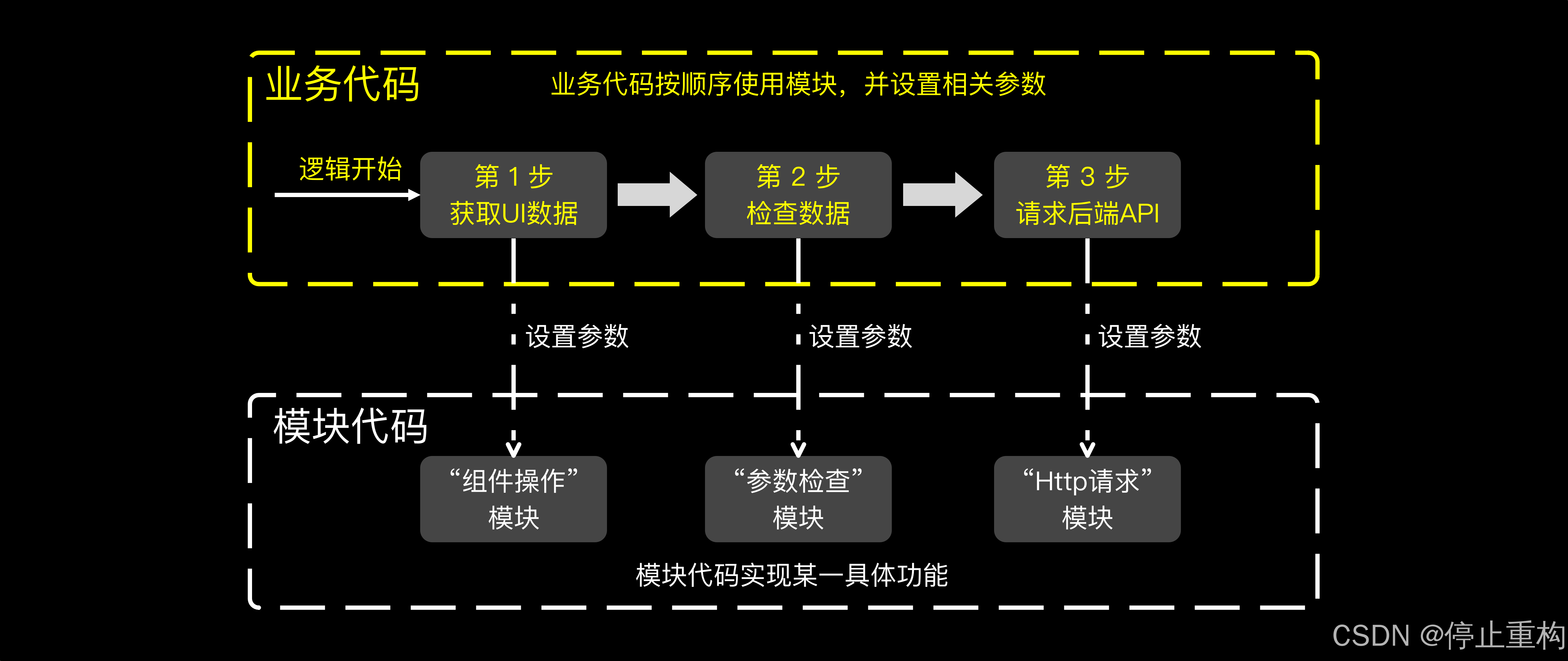 以一个表单页面的提交功能为例,可以对其理解为,第1步“获取UI数据”;第2步“检查数据;”第3步“请求后端API”。