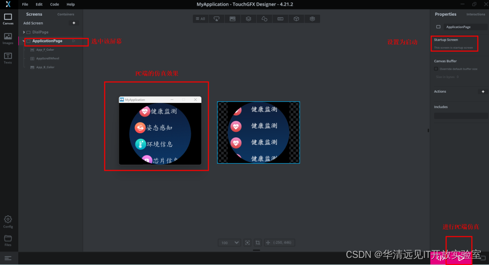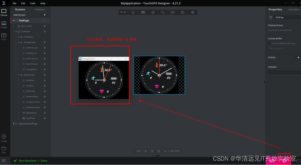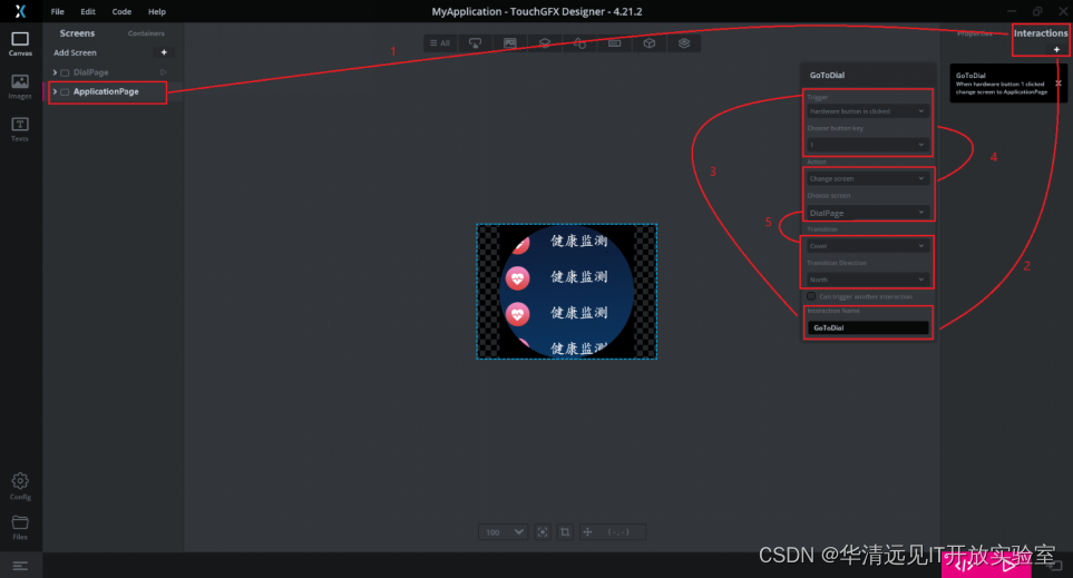 0B-3_STM32U575_MVP_Interactive\TouchGFX 下的0B-2_STM32U575_MVP_Interactive.touchgfx,点击DialPage,在Interactions增加GoToAPP的硬件交互,用于表盘页面与APP页面的切换(硬件按键触发)。本文例程是基于 TouchGFX 的智能手表设计—Designer 软件 UI 设计的例程 0B-2_STM3