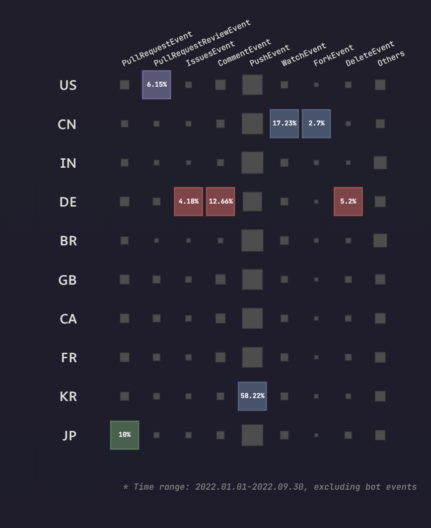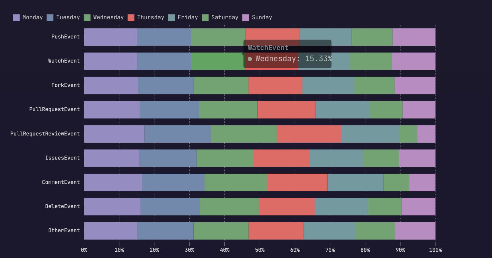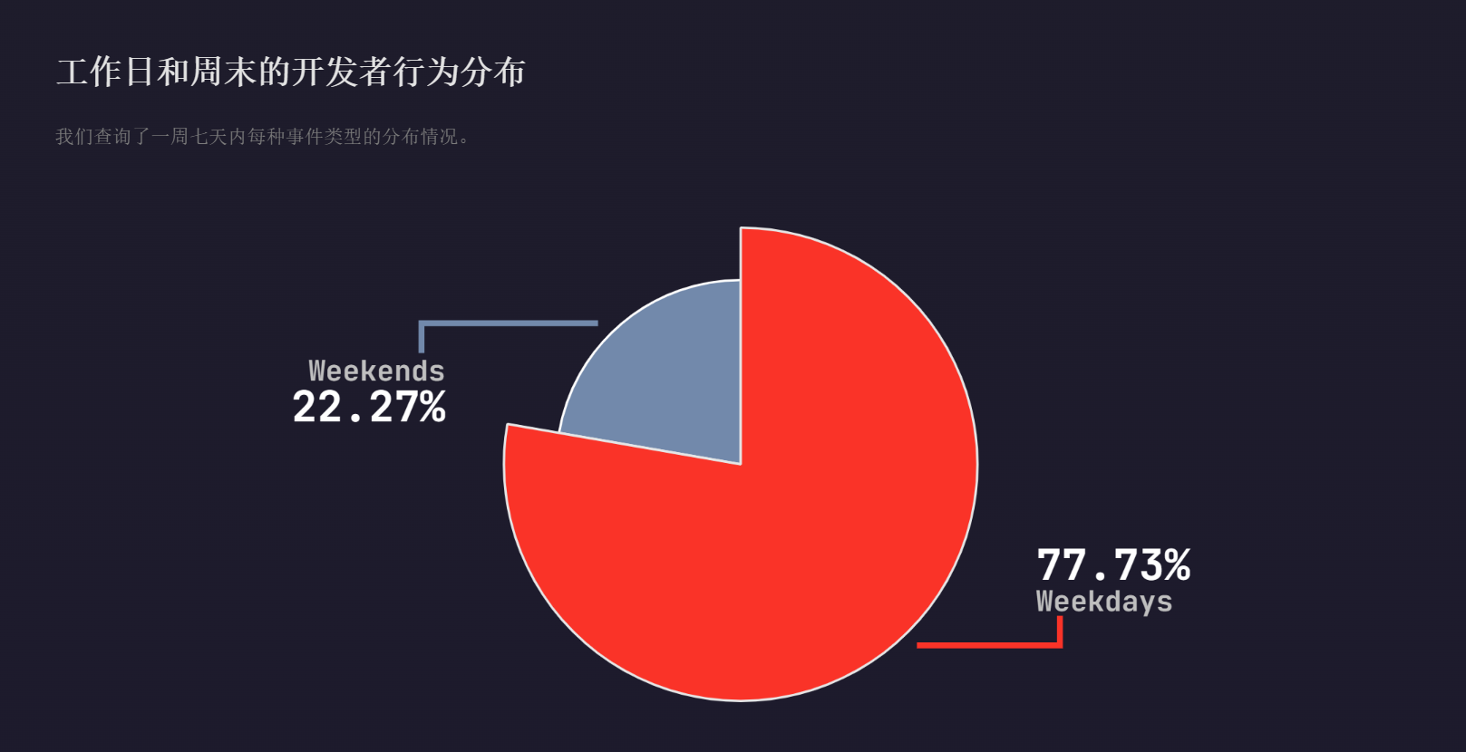 拉取请求事件、拉取请求评审事件和议题事件在星期二的百分比最高,而在周末的百分比最低。推送事件、监视事件和分叉事件活动的数量在工作日和周末相似,而拉取请求审查事件的数量差异最大。观看事件和分叉事件是更多的个人行为,拉取请求审查事件是更多的工作行为,推送事件更多地用于个人项目。